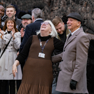 Once everyone is assembled in a semi-circle around the statue, which is draped in a black and white sheet and being held down by one of the Security team, for fear of a premature unveiling, John finally appears with his wife of 57 years, Dellice, his daughters, their husbands and his grandchildren. John is looking resplendent in his trademark overcoat and flat cap, exactly as portrayed by the statue itself - but we don’t actually know that yet ! The organisers appear to want to get on with things, but John has other ideas and walks around the crowd, shaking hands with as many people as he can manage and thanking everyone for coming. Souvenir programmes of the day also need to be signed, and the obligatory selfie are all requested and duly obliged with by John. The unveiling will take a little longer, leaving a rather frustrated Security guard to hang on to the sheet for a bit longer.